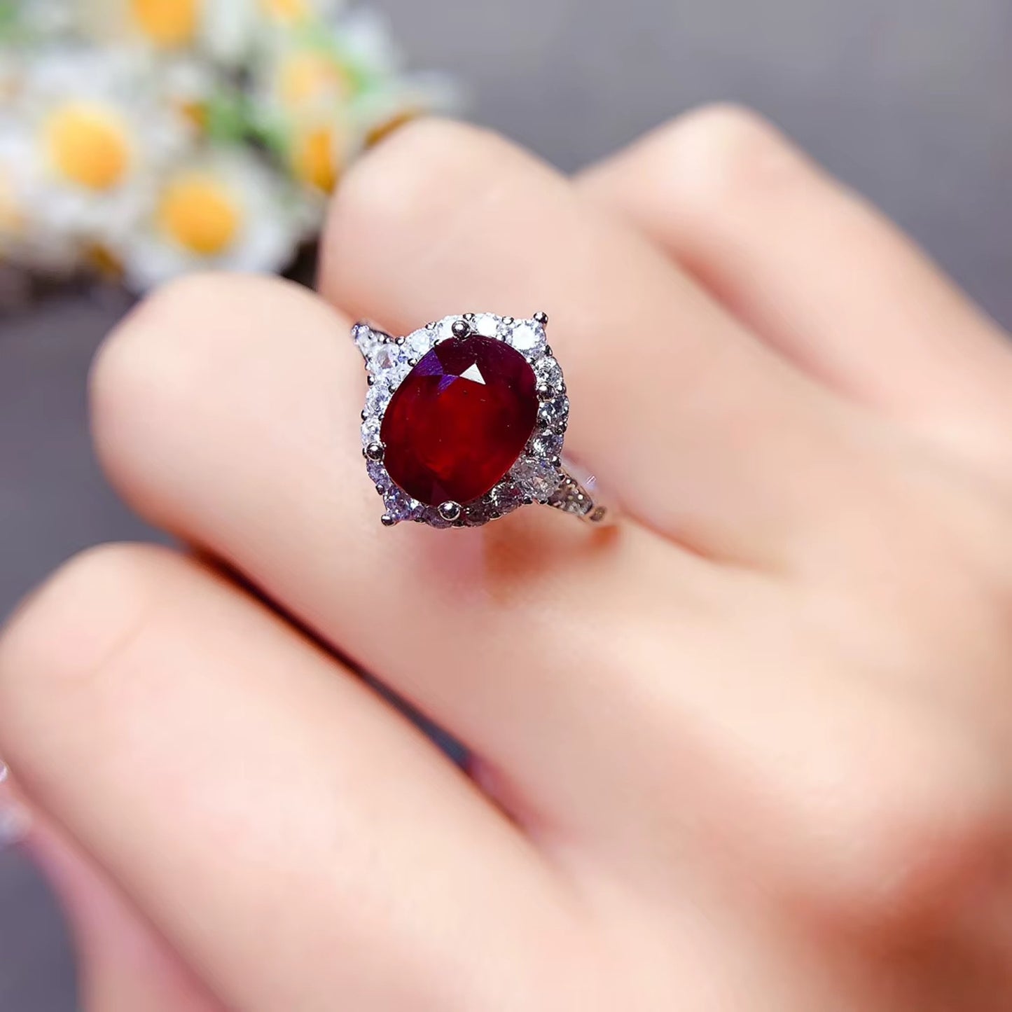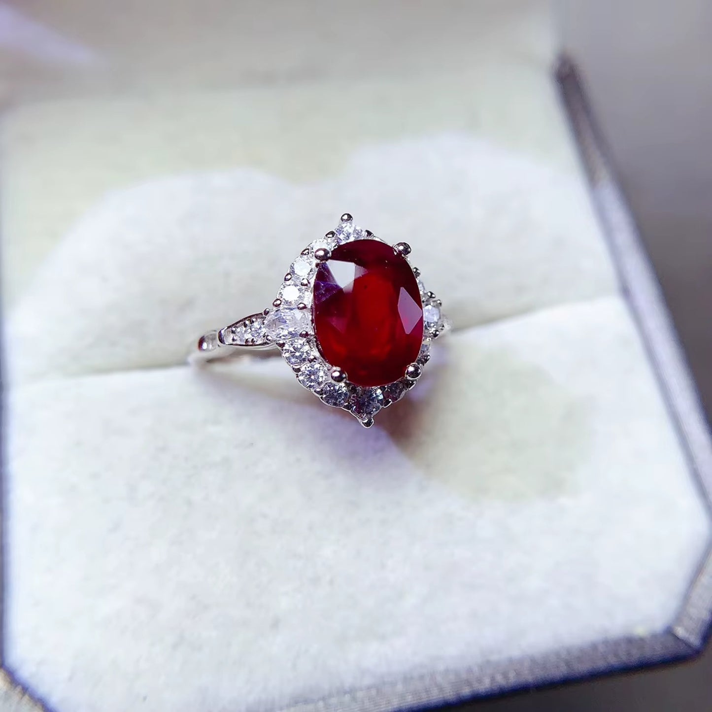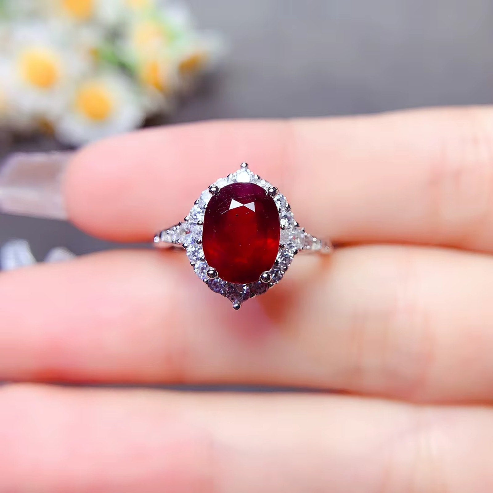 * Platinum-Plated 925 Sterling Silver: Crafted in 925 sterling silver and plated with platinum, this ring offers both durability and a high-end, polished finish that enhances the rich red ruby. The platinum plating adds a luxurious touch, ensuring that the ring has a sleek, long-lasting shine.