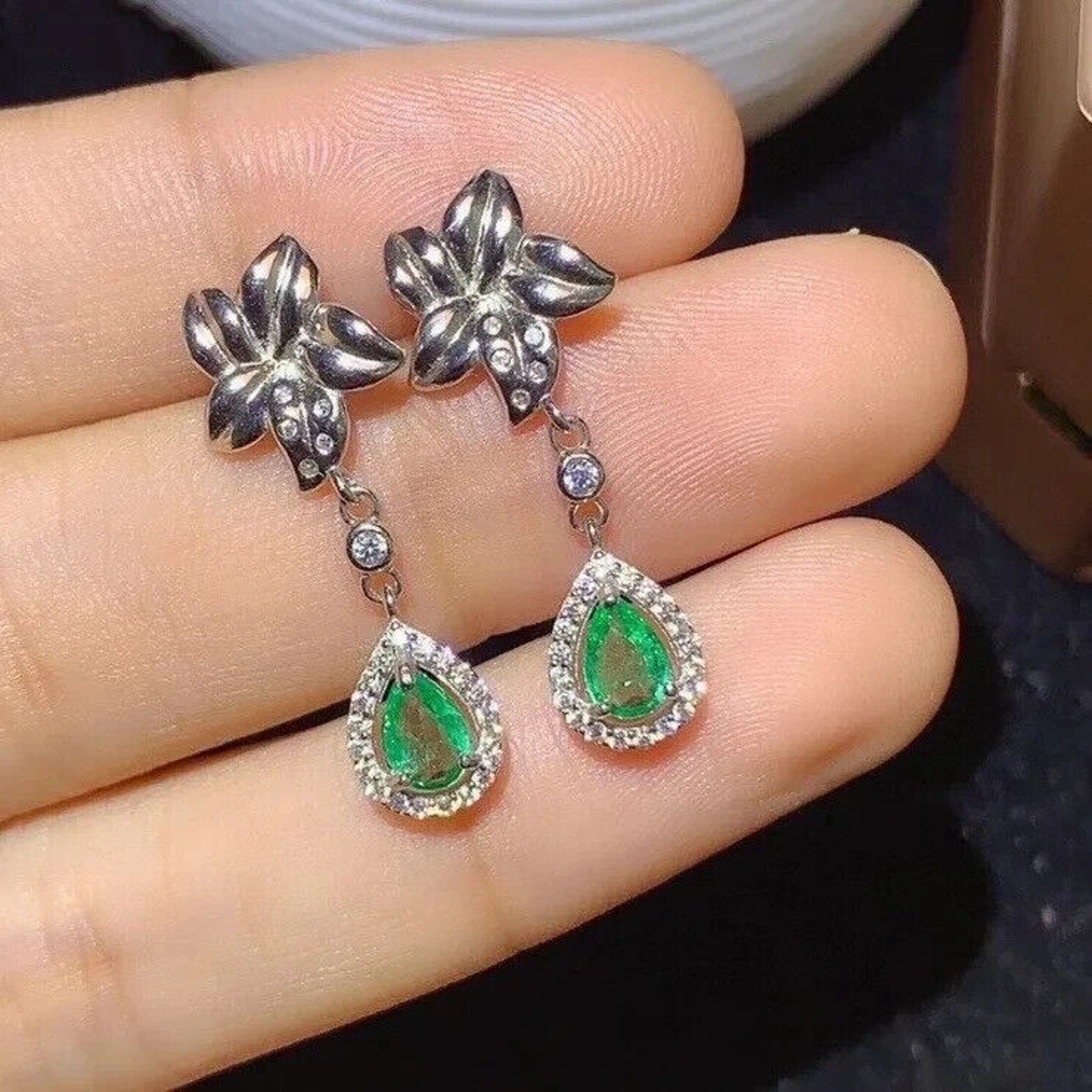 These earrings contain natural Emerald gemstones measuring 4x6mm, and high quality cubic zirconia's. These earrings are 925 Sterling Silver and Platinum Plated, also available in Gold or Rose Gold Plating. This item includes a gift box and a certificate of authenticity with purchase. This item is made to order, please allow 10-15 days for processing and delivery.